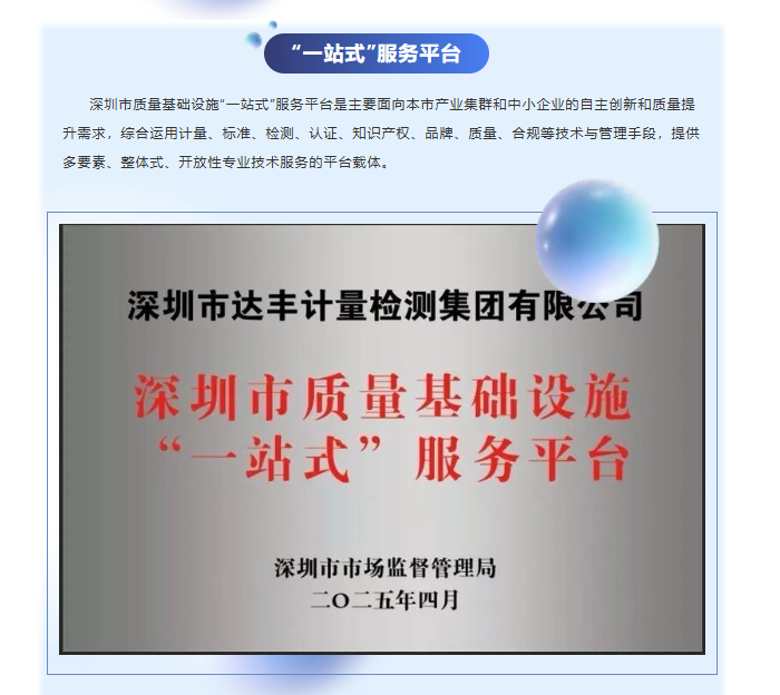 在2025年,深圳市市场监督管理局公布了深圳市质量基础设施“一站式”服务平台名单,深圳市达丰计量检测集团有限公司(简称:达丰计量)凭借卓越的综合实力与专业服务能力成功入选。这不仅是对达丰计量过往努力的高度认可,更是达丰计量在推动质量基础设施服务升级、助力产业高质量发展征程中的一座重要里程碑。